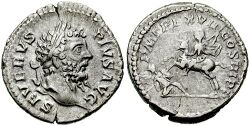 ![]() عملة سپتيميوس سڤروس في 209؛ إلى اليمين، الامبراطور على صهوة جواد رامح، يطعن بريطاني برمحه. |