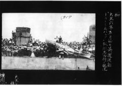 1914: امبراطورية اليابان تعلن الحرب على الامبراطورية الألمانية. الصورة من عام 1917 لسفينة النقل البريطانية ترانسلڤانيا المُدمَّرة التي حاولت إنقاذ المدمرة اليابانية "ساكاكي".