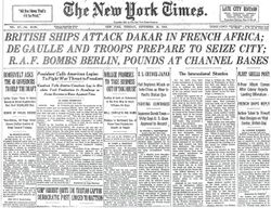 - 1940 - معركة داكار تبدأ. القوات البريطانية والأسترالية وقوات فرنسا الحرة تحاول وتفشل في الاستيلاء على ميناء داكار الاستراتيجي، في مستعمرة غرب أفريقيا الفرنسي التي تسيطر عليها فرنسا ڤيشي.