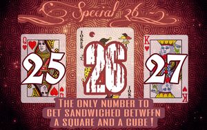 - 26 is the only integer that is one greater than a square (52 + 1) and one less than a cube (33 − 1).[2]