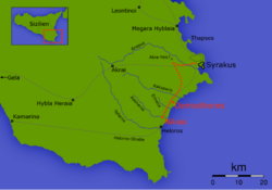 - After suffering a defeat in which the Athenian commander Lamachus is killed, Demosthenes suggests that they immediately give up the siege of Syracuse and return to Athens, where they are needed to defend against a Spartan invasion of Attica. Nicias refuses, but the Syracusans and Spartans under Hermocrates are able to trap the Athenians in the harbour and the Athenians sustain heavy losses in the Battle of Syracuse. Demosthenes is ambushed by the Syracusans and is forced to surrender. Nicias is soon captured as well, and both are executed, with most of the surviving Athenian soldiers sent to work in the Sicilian quarries. Ten proboulos (including Sophocles) are elected to help run Athens.
