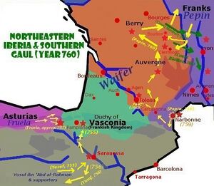 - Frankish King Pepin III ("the Short") begins his expedition to Septimania and Aquitaine. He conquers the cities of Carcassonne, Toulouse, Rodez and Albi. Duke Waifer of Aquitaine confiscates the Church lands, and plunders Burgundy. Pepin invades Aquitanian-held Berry and the Auvergne, capturing the fortresses of Bourbon and Clermont. Waifer's Basque troops are defeated by the Franks, and deported into northern France with their children and wives.