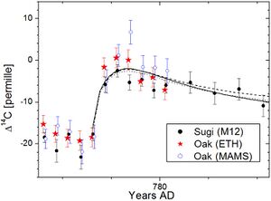 The carbon-14 spike around 774. Colored dots are measurements in Japanese (M12) and German (oak) trees; black lines are the modeled profile corresponding to the instant production of carbon-14.[2]