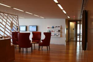 Inside the main lobby, artist Jenny Holzer created an LED installation[16][64][68] with glowing text moving across wide plastic panels.[17] The wall measures 65 ft (20 m) wide and 14 ft (4.3 m) tall. Holzer worked with Klara Silverstein, the wife of Larry Silverstein, to select poetry for the art installation.[68] The wall of the lobby is structurally fortified as a security measure.[68] On the upper stories, some tenants customized the design of their spaces. The space occupied by Mansueto Ventures was designed to maximize natural light exposure and has an open floor plan.[69] The 40th-floor space used by the New York Academy of Sciences was designed by H3 Hardy Collaboration Architecture and includes a reception lobby with an openwork screen; a 296-seat event room; and a horizontal 72-قدم-long (22 m) mural.[37]