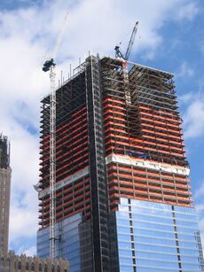 Work next proceeded on the office tower itself. An unusual approach was used in constructing the building; erecting the steel frame before adding the concrete core. This approach allowed the construction schedule to be shortened by a few months.[12] By July 2005, American Express Financial Advisors was planning to lease 20،000 أقدام مربعة (1،900 m2) of space, making it the building's first tenant.[14][15] Although Silverstein intended for the building's design to attract tenants, he wanted occupants to pay $50/sq ft ($540/m2) to lease space by 2005, which New York magazine called "easily the highest price in lower Manhattan".[16]