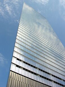 David Childs of Skidmore, Owings and Merrill worked in conjunction with glass artist and designer James Carpenter to create a design that uses ultra-clear, low-iron glass to provide reflectivity and light.[17][60] There are stainless-steel spandrels behind the glass to help reflect sunlight.[17] The spandrels are textured and are curved in a manner that reflects light both from each story's window sills and from the sky.[60] On the lower stories, there are 15-في-5-قدم (4.6 في 1.5 m) panels with steel triangular prisms. There are 130,000 prisms in total, which are tilted at different angles to reflect natural light from the sky. The window panes on the upper floors are 13.6 أقدام (4.1 m) high and are made of white glass with low concentrations of iron.[60] Stainless steel used in the facade is molybdenum-containing Type 316, which provides improved resistance to corrosion.[61]