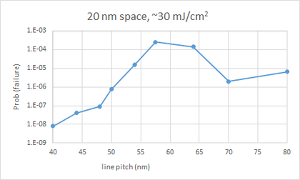 EUV also has issues with reliably printing all features in a large population; some contacts may be completely missing or lines bridged. These are known as stochastic printing failures.[56][57] The defect level is on the order of 1K/mm2.[58]