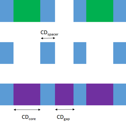 When self-aligned quadruple patterning (SAQP) is used, there is a second spacer that is utilized, replacing the first one. In this case, the core CD is replaced by core CD - 2* 2nd spacer CD, and the gap CD is replaced by gap CD - 2 * 2nd spacer CD. Thus, some feature dimensions are strictly defined by the second spacer CD, while the remaining feature dimensions are defined by the core CD, core pitch, and first and second spacer CD's. The core CD and core pitch are defined by conventional lithography, while the spacer CDs are independent of lithography. This is actually expected to have less variation than pitch splitting, where an additional exposure defines its own CD, both directly and through overlay.