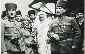 "أحمد الشريف، شيخ الطريقة السنوسية بعد قتال عنيف احتلت القوات الاستعمارية الإيطالية واحة الكفرة آخر قاعدة للمقاتلين السنوسيين، ليبيا كلها الآن بيد الإيطاليين"