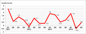 أصبح داود أوغلو رئيساً للوزراء في وقت التباطؤ الاقتصادي والتشكك، والذي يلقي بلائمته على الاقتصاد العالمي الضعيف، وخاصةً منطقة اليورو. خفضت الحكومة توقعات النمو الاقتصادي من 4% إلى 3.3% في عام 2014 ، ومن 5% إلى 4% في عام 2015. كما خفضت منظمة التعاون والتنمية الاقتصادية توقعاتها من 4% إلى 3.2% عام 2015 وقدرت النمو الاقتصادي في 2016 بنسبة 4%. في 6 نوفمبر 2014، أعلن داود أوغلو عن خططاً لتعزيز الاقتصاد من خلال المزيد من التكامل العالمي. وشملت حزم الإصلاح خطة من 9 نقاط لتعزيز قطاعات التكنولوجيا والطاقة والصحة والسياحة. مع الناتج المحلي الإجمالي البالغ 820 بليون دولار، وعجز ميزانية بلغ 7%، وعجز محاسبي حالي نسبته 7.9% ومعدل بطالة يقارب 10% في 2013، كان هدف حكومة داود أوغلو رفع الناتج المحلي الإجمالي إلى 1.3 تريليون دولار، عجز الميزانية إلى 5.2%، العجز المحاسبي الحالي لنسبة 5.2% ومعدل بطالة 7% بحلول 2018.[34]كما هدف داود أغول إلى الحد من اعتماد الدولة على واردات الطاقة الأجنبية، وتعهد بعدم متابعة الأجندة الاقتصادية الرائجعة فيما قبل الانتخابات العامة 15 يونيو.[35]