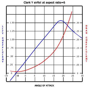 A lift and drag curve obtained in wind tunnel testing is shown on the right. The curve represents an airfoil with a positive camber so some lift is produced at zero angle of attack. With increased angle of attack, lift increases in a roughly linear relation, called the slope of the lift curve. At about 18 degrees this airfoil stalls, and lift falls off quickly beyond that. The drop in lift can be explained by the action of the upper-surface boundary layer, which separates and greatly thickens over the upper surface at and past the stall angle. The thickened boundary layer's displacement thickness changes the airfoil's effective shape, in particular it reduces its effective camber, which modifies the overall flow field so as to reduce the circulation and the lift. The thicker boundary layer also causes a large increase in pressure drag, so that the overall drag increases sharply near and past the stall point.