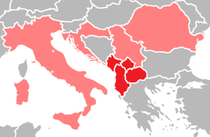 The language is spoken by approximately 6 million people in the Balkans, primarily in Albania, Kosovo, North Macedonia, Serbia, Montenegro and Greece.[1] However, due to old communities in Italy and the large Albanian diaspora, the worldwide total of speakers is much higher than in Southern Europe and numbers approximately 7.5 million.[1][2]