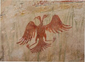 In Albanian mythology, the physical phenomena, elements and objects are attributed to supernatural beings. The deities are generally not persons, but animistic personifications of nature.[6] The earliest attested cult of the Albanians is the worship of the Sun and the Moon.[2] In Albanian folk beliefs, the earth cult and sky cult have a special place, and an important role is played by fire, which is considered a living, sacred or divine element used for rituals, sacrificial offerings and purification.[7] Fire worship is associated with the cult of the Sun, the cult of the hearth and the cult of fertility in agriculture and animal husbandry.[8] Besa is a common practice in Albanian culture, consisting of an oath taken by Sun, by Moon, by sky, by earth, by fire, by stone, by mountain, by water and by snake, which are all considered sacred objects.[9] Associated with freedom and heroism, the eagle is the animal totem of the Albanian people.[10] A widespread folk symbol is the serpent, a totem of the Albanians associated with earth, water, sun, hearth and ancestor cults, as well as destiny, good fortune and fertility.[11] The cult of the Sun and the Moon also appears in Albanian legends and folk art.[12]