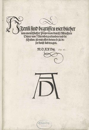 Title page of Vier Bücher von menschlicher Proportion showing the monogram signature of Albrecht Dürer