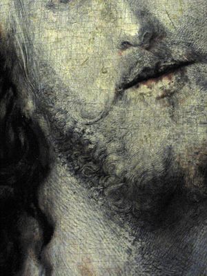 هذه التفصيلة من سلڤاتوره موندي، رسم زيتي غير مكتمل على الخشب تـُظهر أسلوب دورر التمهيدي عالي التفصيل. انظر اللوحة الكاملة