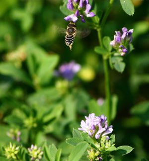 Alfalfa leafcutter bee, Megachile rotundata, a pollinator on alfalfa flower