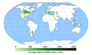 يزرع نبات الفصفصة على مساحة تبلغ نحو 32 مليون هكتار على مستوى العالم. ومناطق زراعته الرئيسية هي أمريكا الجنوبية وأمريكا الشمالية وأستراليا وجنوبي أوروبا والاتحاد السوفييتي (سابقاً). وتنتج الولايات المتحدة الأمريكية نحو 77 مليون طن متري سنويًا، وتأتي كل من الأرجنتين والاتحاد السوفييتي (سابقاً) في المرتبة الثانية. وفي الولايات المتحدة تأتي وسكنسن وكاليفورنيا في طليعة الولايات التي هي أعلى إنتاجاً له. أما في كندا فينتج في مقاطعات ألبرتا ومانيتوبا.