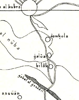 خريطة النوبة للإدريسي (1192 م). علوة ("جلوة") تم تحديد موقعها بشكل خاطئ شمال مقرة ("دمقلة"، بعد دنقلة، عاصمة المقرة).