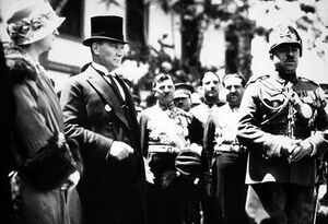 Amanullah travelled to Europe in late 1927.[17] The Afghan King and Queen set out from Karachi and en route they met with King Fawad of Egypt in Cairo. They undertook a whirlwind European visit: Italy, arrival on 8 January 1928, where they met with King Victor-Emanuel III of Italy along with his Prime Minister, Benito Mussolini and Pope Pius XI in the Vatican City; France, arrival in Nice on 22 January 1928, in Paris on 25 January, meeting with President Doumergue; Belgium, arrival on Brussels on 8 February, meeting with King Albert I and Queen Elisabeth of Belgium. The next stop was Germany. The germanophile king arrived via Germany in Berlin on 22 February to meet President Paul von Hindenburg the same day. Next he travelled to Great Britain as guests of King George V and Queen Mary. The steam ship SS Maid of Orleans arrived in Dover on 13 March. The royal couple left England on 5 April to Poland. On their way, they had a longer stopover in Berlin where the Amir underwent an emergency tonsillectomy. The royal train with the Amir back on board arrived in the Polish border town of Zbąszyń on April, 28. The next day it pulled into Warsaw to be met by Polish ministers, the speaker of the Sejm and the country's president Ignacy Mościcki. At his request Amanullah was granted a possible audience with the First Marshal of Poland Józef Piłsudski. The Afghan party departed from Warsaw travelling east across the country to the border with the Soviet Union on 2 May 1928.[18]
