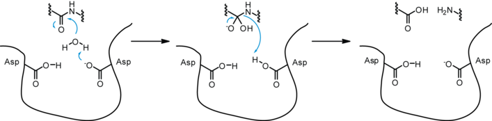 Possible mechanism for Aspartyl Protease cleaving a peptide bond. Only the peptide bond and active site are shown.