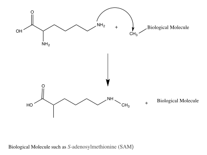 Once the peptide chain is synthesized, it still must be modified. Post-translational modifications can occur before protein folding or after. Common biological methods of modifying peptide chains after translation include methylation, phosphorylation, and disulfide bond formation. Methylation often occurs to arginine or lysine and involves adding a methyl group to a nitrogen (replacing a hydrogen). The R groups on these amino acids can be methylated multiple times as long as the bonds to nitrogen does not exceed 4. Methylation reduces the ability of these amino acids to form hydrogen bonds so arginine and lysine that are methylated have different properties than their standard counterparts. Phosphorylation often occurs to serine, threonine, and tyrosine and involves replacing a hydrogen on the alcohol group at the terminus of the R group with a phosphate group. This adds a negative charge on the R groups and will thus change how the amino acids behave in comparison to their standard counterparts. Disulfide bond formation is the creation of disulfide bridges (covalent bonds) between two cysteine amino acids in a chain which adds stability to the folded structure.[17]
