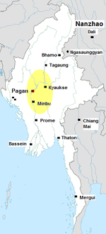 Anawrahta Minsaw (بالبورمية: အနော်ရထာ မင်းစော, تـُنطق [ʔənɔ̀jətʰà mɪ́ɴ sɔ́]; 11 May 1014 – 11 April 1077) was the founder of the Pagan Empire. Considered the father of the Burmese nation, Anawrahta turned a small principality in the dry zone of Upper Burma into the first Burmese Empire that formed the basis of modern-day Burma (Myanmar).[2][3] Historically verifiable Burmese history begins with his accession to the Pagan throne in 1044.[4]