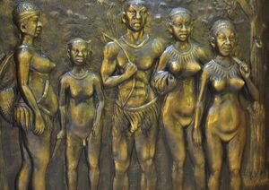 Andamanese Mythology held that human males emerged from split bamboo, whereas women were fashioned from clay.[45] One version found by Alfred Reginald Radcliffe-Brown held that the first man died and went to heaven, a pleasurable world, but this blissful period ended due to breaking a food taboo, specifically eating the forbidden vegetables in the Puluga's garden.[46] Thus catastrophe ensued, and eventually the people grew overpopulated and didn't follow Puluga's laws,. Hence, there was a Great Flood that left four survivors, who lost their fire.[47][48]