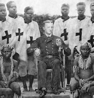 A photograph of M.V. Portman with a group of Andamanese people
