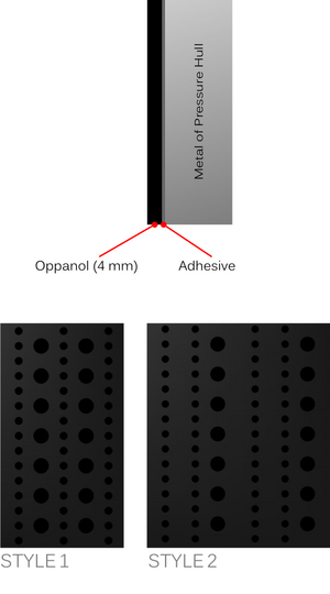 Modern materials consist of a number of layers and many different sized voids, each targeted at a specific sound frequency range at different depths. Different materials are sometimes used in different areas of the submarine to better absorb specific frequencies associated with machinery at that location inside the hull.[بحاجة لمصدر]