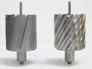 An annular cutter (also called a core drill, core cutter, broach cutter, trepanning drill, hole saw, or cup-type cutter) is a form of core drill used to create holes in metal. An annular cutter, named after the annulus shape, cuts only a groove at the periphery of the hole and leaves a solid core or slug at the center.[1]