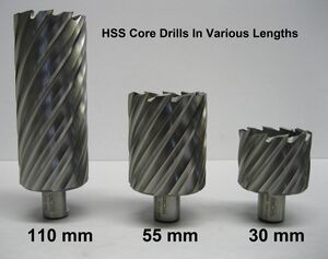 The HSS Standard core drills are made from M2 steel. These core drills are one of the most popular core drills in Western countries due to their cost and resharpening advantage. The Standard HSS core drills are used to drill Mild and Structural steel, Aluminium, Stainless steel of lower BHN., etc.[بحاجة لمصدر]