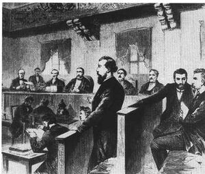 Wilhelm Liebknecht (standing in the center of the witness stand), August Bebel (right edge of the picture, in profile) and Adolf Hepner (behind Bebel) as defendants in the Leipzig high treason trial (March 11–26, 1872)
