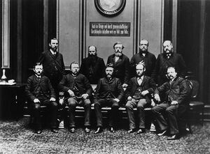 الفصيل الاشتراكي في الرايخس‌تاگ، 1889. الجلوس (من اليسار): Georg Schumacher, Friedrich Harm, August Bebel, Heinrich Meister, Karl Frome. الوقوف (من اليسار): Johann Heinrich Wilhelm Dietz, August Kühn, Wilhelm Liebknecht, Karl Grillenberger, Paul Singer.