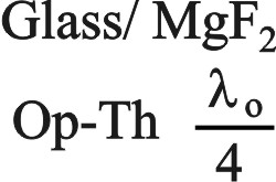 مثال: تسقط موجة ضوئية ذات طول الموجة (1nm=10-9m)λ0= 500nm من الهواء n0=1 على الزجاج نوع BK7 حيث ng=1.52، فمن الشرط الثاني يتبين أن nf. d=125nm، ومن الشرط الأول يتبين أن nf=1.23، ولكن لا توجد في الطبيعة مادة بهذه القرينة الصغيرة جداً، وأصغر قرينة متوفرة وتتمتع بثبات جيد هي قرينة فلوريد المغنزيوم MgF2 حيث nMgF2=1.38. لذلك يُكتفي بتحقيق الشرط الثاني أي بسماكة ضوئية optical thickness واختصاراً Op-Th، للطبقة المرسبة مقدارها والتي تخفِّض العاكسية إلى R =1.2%. ويمثل الطلاء بـ:(شكل 9)