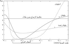 ويُلاحظ أن العاكسية تزداد بسرعة مع ابتعاد طول الموجة عن λ0. ويوضح المخطط الشعاعي (الشكل ـ2) الأمواج المنعكسة في هذه الحالة. حيث يؤدي تغير طول الموجة إلى دوران الشعاعين ، في حين يحافظ الشعاع على اتجاهه مما يؤدي إلى تشكل محصلة تكبر كلما ابتعدنا عن λ0. يبين المنحني (2) في الشكل 4 تغير العاكسية الطاقية بدلالة طول الموجة لهذا الطلاء.
