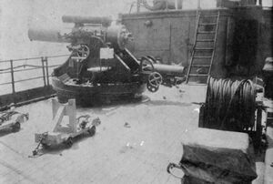 There were no means to detect submerged U-boats, and attacks on them were limited at first to efforts to damage their periscopes with hammers.[6] The Royal Navy torpedo establishment, HMS Vernon, studied explosive grapnel sweeps; these sank four or five U-boats in the First World War.[7] A similar approach featured a string of 70 lb (32 kg) charges on a floating cable, fired electrically; an unimpressed Admiral Edward Evans considered any U-boat sunk by it deserved to be.[7]