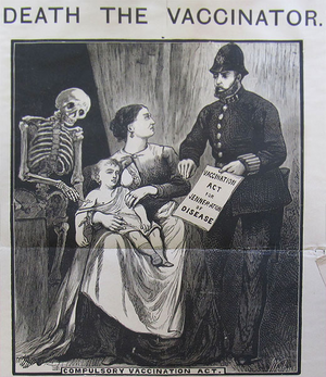 In the United Kingdom, the Compulsory Vaccination Act of 1853 required that every child be vaccinated within three or four months of birth.[8] It set a precedent for the state regulation of physical bodies, and was fiercely resisted.[9] In 1854. John Gibbs published the first anti-compulsory-vaccination pamphlet, Our Medical Liberties.[10] By the 1860s, anti-vaccinationism in Britain was active in the working class, labor aristocracy, and lower middle class, all of which were under economic stress. It had become associated with alternative medicine and was part of a larger culture of social and political dissent that included both labor unions and religious dissenters. [9][11]