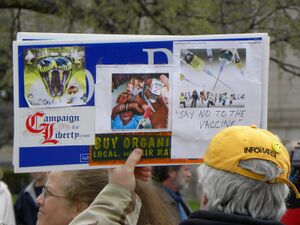 Anti-vaccine activism is organized activity designed to increase vaccine hesitancy, often by disseminating misinformation or disinformation.[1] Although myths, conspiracy theories, misinformation and disinformation spread by the anti-vaccination movement and fringe doctors increases vaccine hesitancy and public debates around the medical, ethical, and legal issues related to vaccines, there is no serious hesitancy or debate within mainstream medical and scientific circles about the benefits of vaccination.[2]