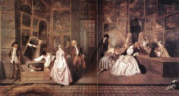 L'Enseigne de Gersaint (1720): في واحدة من آخر لوحات واتو، پورتريه لويس الرابع عشر ومجموعته الفنية تـُجمع للنقل. لم يكن للرسام سبب لتوقع أن اسمه سيذكره أحد بعد وفاته.