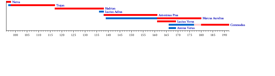 The Nerva–Antonine dynasty comprised seven Roman emperors who ruled from 96 CE to 192: Nerva (96–98), Trajan (98–117), Hadrian (117–138), Antoninus Pius (138–161), Marcus Aurelius (161–180), Lucius Verus (161–169), and Commodus (177–192). The first five of these are popularly known as the "Five Good Emperors".