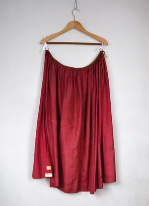 Wealthy housewives of the time were also expected to show off their family's status in society and their commitment to the domestic life. They did this by also wearing aprons, though the aprons were far more elegant and expensive than the maid's white cotton apron. Popular materials included black lace, satin with chenille borders, shot silk, and satin.[15] An apron of this caliber was necessary with a morning dress during the early nineteenth century for a woman of status.[16] During this time, "never was there a greater rage than for aprons (of satin and shot silk) for morning or afternoon."[17] The elegant and colorful apron was also a symbol that a woman had the funds to be swindled by travelling merchants into purchasing "a gaudy ribbon or shining pair scissors."[18]