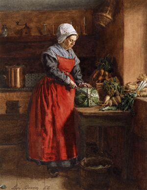 Aprons for both maids and housewives were not just worn in the home, but out on the town as well. The painting "Scene in Frankfurt Fair, April 1835. Part of the Line of Stalls Extending Along the River Mayn" by Mary Ellen Best shows a mother in a highly decorated and colorful apron and her daughter in a green pinafore apron.[20] They are out shopping in a market and through the appearance of their stylish aprons, they are exhibiting their upper-middle class status as well as their ties to female domesticity.
