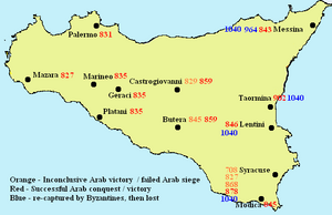 The Arabs did not relinquish their designs on Asia Minor and in 838 began another invasion, sacking the city of Amorion.[55] With internal Byzantine unity weakened, along with their ties to the West, Crete fell to the Saracens in 824, and Sicily was slowly lost over a 75-year period. Using Tunisia as their launching pad, the Arabs started by conquering Palermo in 831, Messina in 842, Enna in 859.