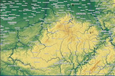 Morphologically connected mountains of Ardennes and Eifel, framed by the rivers Semois, Meuse, Moselle and Rhine. The highest elevation is the Hohe Acht at 746.9 m above sea level. NHN