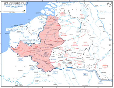 Battle of France (1940) The Germans execute Erich Von Manstein's plan for Fall Gelb. Armoured divisions cross the Meuse (16 May), (principally in Dinant), Sedan and the Ardennes. The Ardennes are located just to the east of the red shading which marks the extent of the German advance. On 16 May General Maurice Gamelin said he could no longer protect Paris because he had lost the Ardennes.