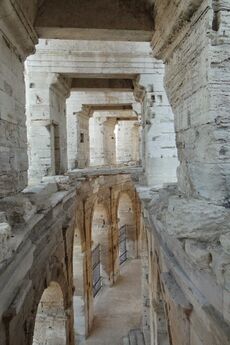 Arelate was a city of considerable importance in the province of Gallia Narbonensis. It covered an area of some 40 هكتار (99 acre) and possessed a number of monuments, including an amphitheatre, triumphal arch, Roman circus, theatre, and a full circuit of walls. Ancient Arles was closer to the sea than it is now and served as a major port. The river has carried centuries of silt that has filled in the former harbor. The city had (and still has) the southernmost bridge on the Rhône.