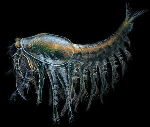 The earliest fossil of likely pancrustacean larvae date from about in the Cambrian, followed by unique taxa like Yicaris and Wujicaris.[80] The purported pancrustacean/crustacean affinity of some cambrian arthropods (e.g. Phosphatocopina, Bradoriida and Hymenocarine taxa like waptiids)[81][82][83] were disputed by subsequent studies, as they might branched before the mandibulate crown-group.[80] Within the pancrustacean crown-group, only Malacostraca, Branchiopoda and Pentastomida have Cambrian fossil records.[80] Crustacean fossils are common from the Ordovician period onwards.[84] They have remained almost entirely aquatic, possibly because they never developed excretory systems that conserve water.[52]