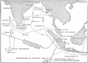 SMS Emden was left behind by Admiral Graf Maximilian von Spee when he began his retreat across the Pacific. The ship won the Battle of Penang, in which the Germans sank a Russian cruiser and a French destroyer. Emden also harried merchant vessels of the Allies and destroyed over thirty of them. She went on and bombarded Madras, India, causing damage to British oil tanks and sinking an Allied merchant ship. The attack caused widespread panic in the city and thousands of people fled from the coast, fearing that the Germans may have begun an invasion of India as a whole.