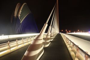 The bridge[2] (crossing the Turìa Gardens) is located in central Valencia, Spain in its City of Arts and Sciences[3] complex, which also includes a science museum (Museo de las Ciencias Principe Felipe[4]), a covered plaza for concerts and sporting events (L'Àgora[5]), the 3rd largest aquarium in the world (L'Oceanogràfic[6]), a multifunctional arts complex and opera house (Palau de les Arts Reina Sofia[7]) and, planetarium and Imax (L'Hemisfèric[8])