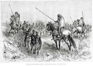 According to John K. Thornton, Europeans usually bought enslaved people who had been captured in endemic warfare between African states.[3] Some Africans had made a business out of capturing war captives or members of neighboring ethnic groups and selling them.[90] A reminder of this practice is documented in debates over the trade in the British Parliament in 1806: "All the old writers ... concur in stating not only that wars are entered into for the sole purpose of making slaves, but that they are fomented by Europeans, with a view to that object."[91] People living around the Niger River would be transported from these markets to the coast and sold in European trading ports, in exchange for muskets and manufactured goods such as cloth or alcohol.[92] The European demand for slaves provided a new and larger market for the already existing trade.[93] While those held as slaves in their own region of Africa could hope to escape, those shipped away had little chance of returning to their homeland.[94]